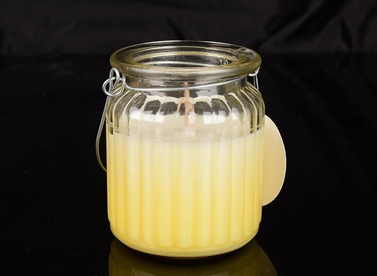 | Description | Cheap ribbed GLASS CANDLE JAR with metal handle |
